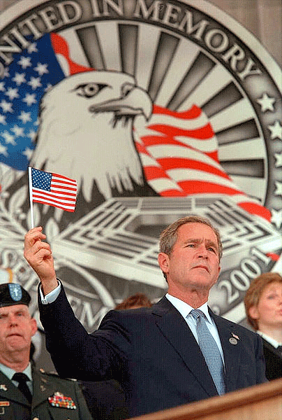 | December 11, 2001 | December 12, 2001 | December 14, 2001 | December 17, 2001 | photo credit: Eric DraperThere are tons of flags on this 9/11 memorial day. Bush has his hand over his heart, obscuring the lapel. |