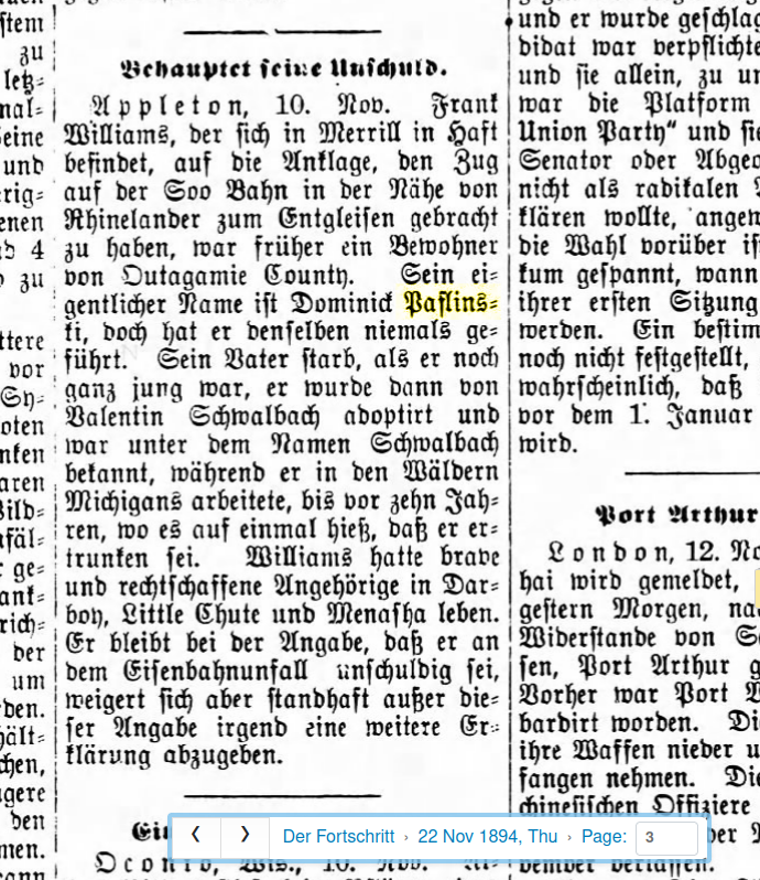 "Frank Williams Located. Frank Williams, who is under arrest at Merrill, on a charge of being implicated in wrecking the train on the Soo Line near Rhinelander, was formerly a resident of Appleton. The fellow's real name is Dominick Paflinski, but he has never lived under that name. His father dying when he was young, he was adopted by Valentine Schwalbach and lived under that name while working in the woods of Michigan, till ten years ago, when it was reported that he was drowned. Williams has respectable relatives in Darboy, Little Chute and Menasha. He sticks to the story that he is not guilty, but further than that he refuses to talk."