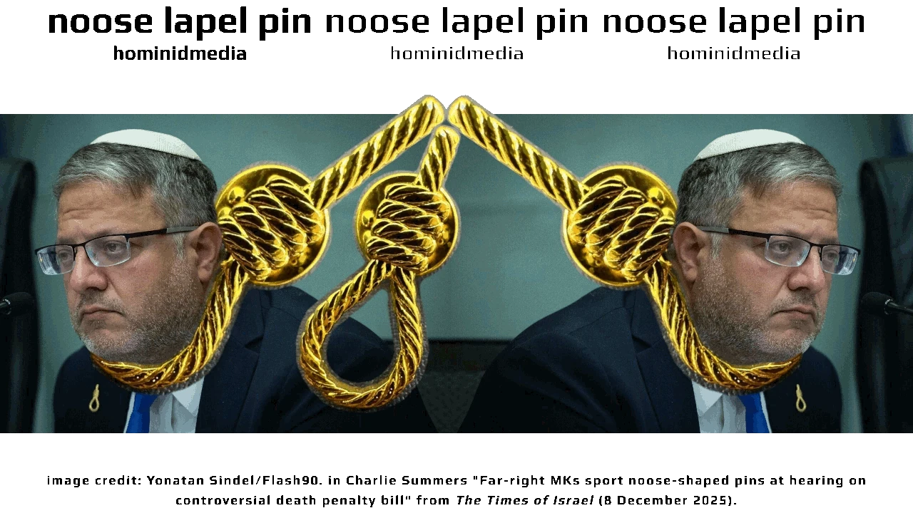 Sharon Zhang "Israeli Ministers wear Noose Pins to Symbolize Support for Killing Palestinians" truthout.org 8 December 2025.